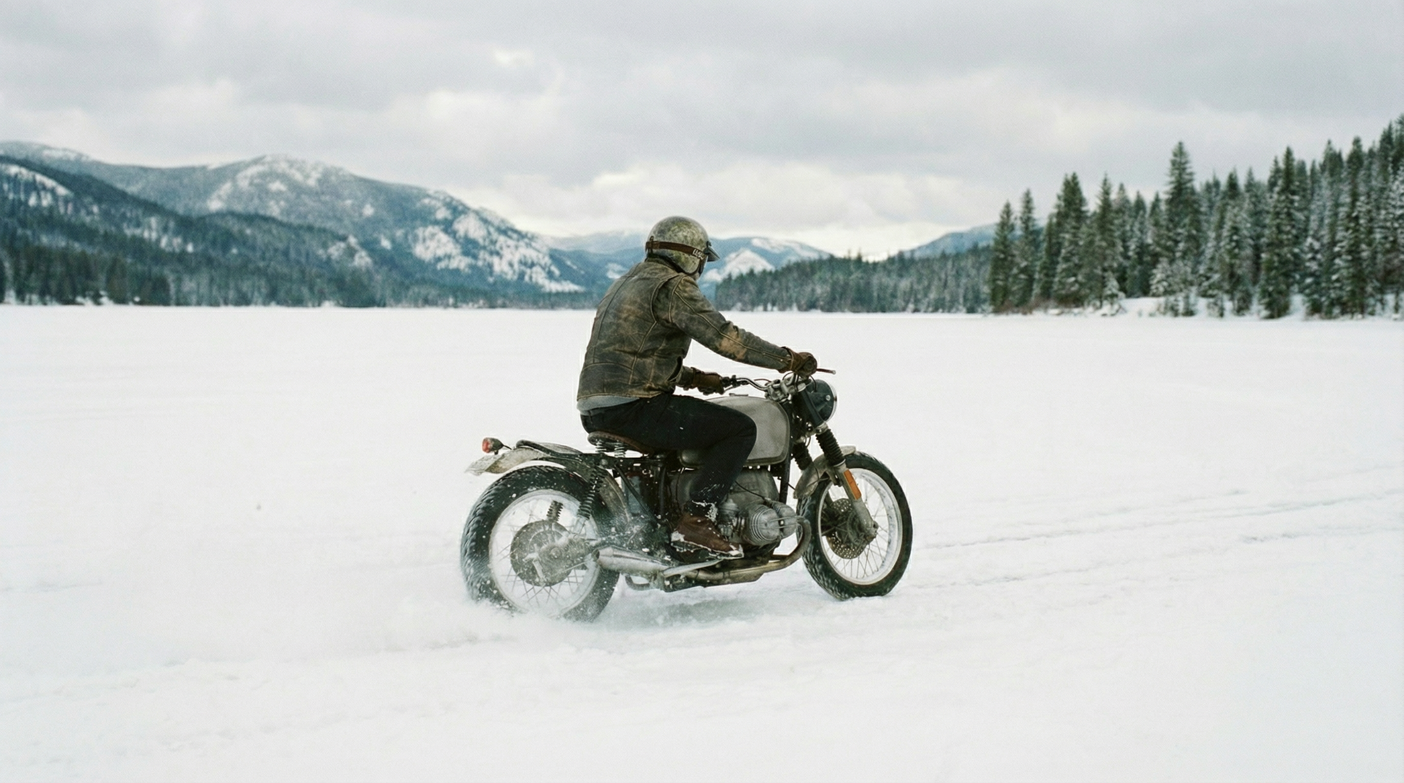 Shot 1 - Low-angle follow-up shot from the rear, with the rider driving forward. Shot 2 - Low-angle close-up shot from the side, close-up shot of the motorcycle wheel. Shot 3 - First-person subjective perspective of the rider, with the motorcycle handlebar and dial in front. Shot 4 - Follow-up shot of the motorcycle facing the front, medium shot. The rider's helmet is facing the camera. Shot 5 - sideways flat shot with follow-up shot (slight follow-up shift). Shot 6 - high-altitude slightly zoomed-in perspective. The camera is zoomed up to shoot the snowmobile driving deep into the snowfield. The ruts draw winding lines on the pure white snow, and there are forests covered with snow on both sides.