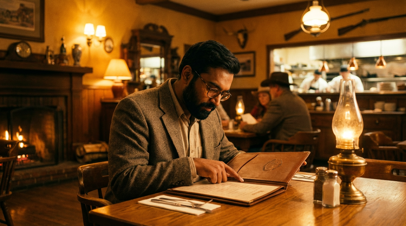 A middle-aged man is ordering food at a Western restaurant, speaking in English with an Indian accent: "Excuse me, I would like to order a seafood pasta, and a filet mignon. Medium-rare", then looking up and continuing: "And, do you have any drink recommendations?"