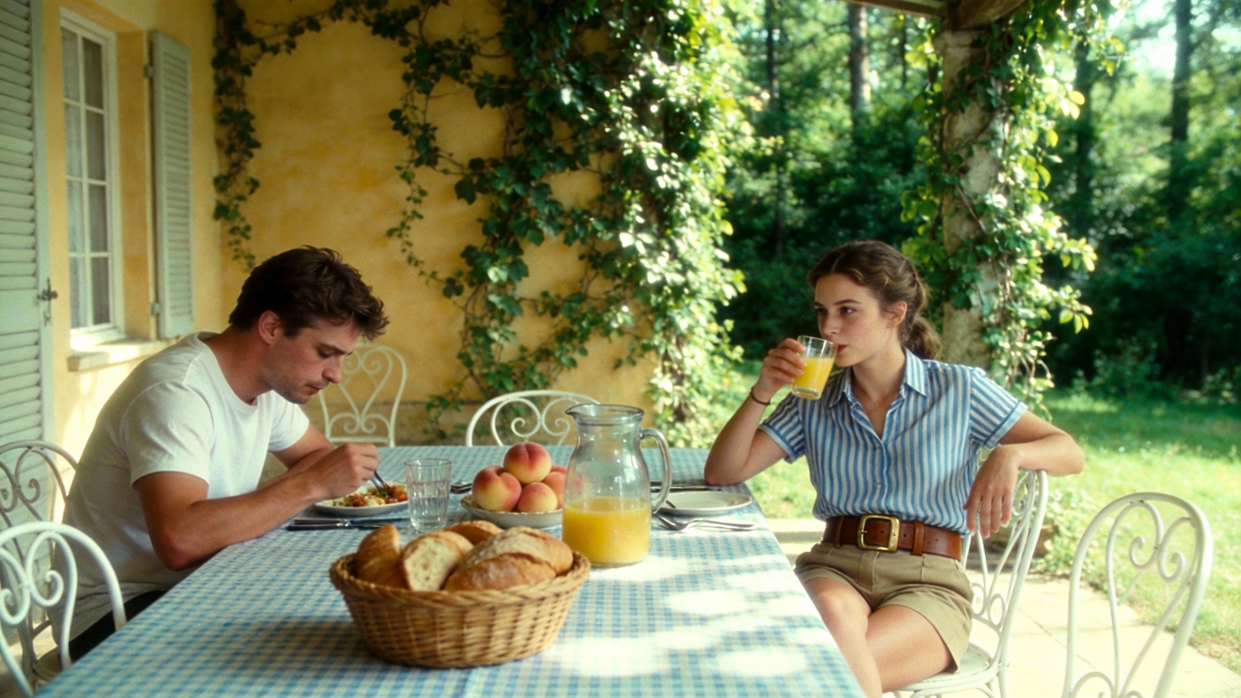 Outdoor terrace scene in a European villa. At the dining table covered with blue and white plaid tablecloth, a young white woman wears a blue and white striped short-sleeved shirt, khaki shorts, and a brown belt, sitting barefoot. Opposite is a young white man wearing a white T-shirt. The camera advances and the woman shakes the juice in the glass, looking toward the distant woods and saying, "These trees will turn yellow in a month, won't they?". The camera closes up and the man lowers his head and says, "but they'll be green again next summer." Then the woman turned her head, looked at the man opposite with a smile, and said, "Are you always this optimistic? Or just about summer?" Then the man raised his head, looked at the girl and said, "Only about summers with you."