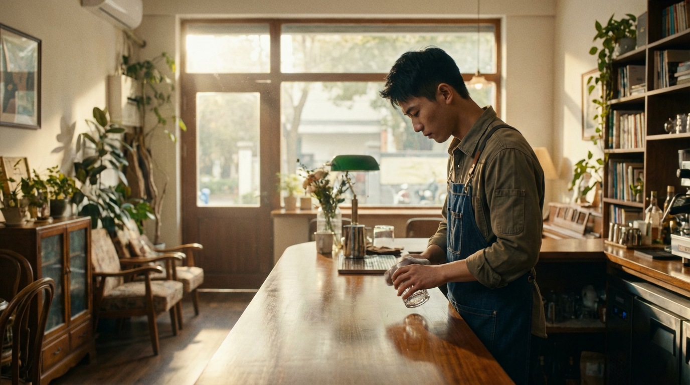 Fixed shot of a young barista wiping his cup. The barista raised his head and looked at the camera and said in Sichuan dialect: "Hey, you're here. What do you want to drink today, iced Americano or latte? New beans just arrived today."