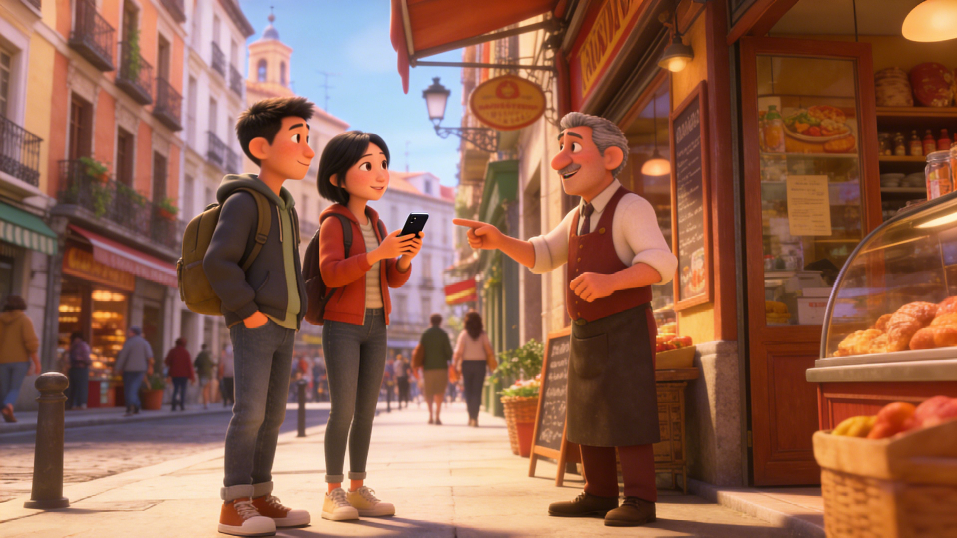 The sun was shining all over the old streets of Madrid. In front of the bakery on the street, a female Chinese tourist and a boy wearing a gray hoodie walked towards the shop assistant, both of them smiling politely. Female tourist (speaks slowly, with a bad accent, in Spanish): Disculpe, ¿dónde está la plaza mayor? The white-haired Spanish clerk (pointing sideways, speaking briskly, in Spanish): Por allí, a dos calles. Muy cerca. The female tourists nodded in thanks, and the male tourists nodded in agreement (Spanish): Muchas gracias. The clerk smiled and nodded in response, and the two turned and walked in the direction indicated.