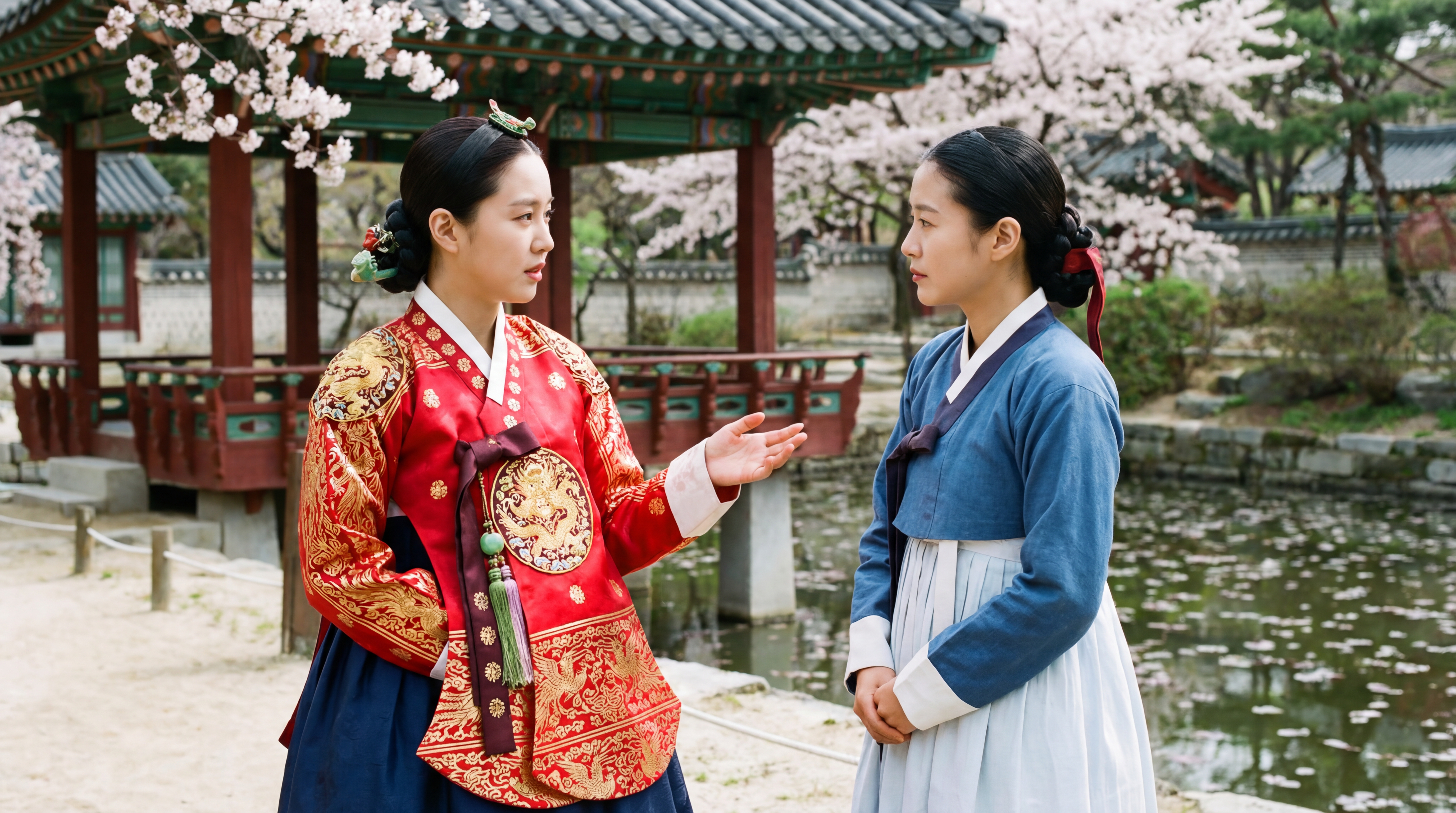 The camera focuses on the interaction between the two. The lady's eyes are gentle and the maid lowers her head to listen. The noble lady raised her hand to flick her sleeves and spoke in a gentle tone: "오늘 후원에서 피어난 꽃을 보니, 시원한 바람이 분다. 너도 함께 걸어볼까?" The maid leaned forward slightly and responded respectfully: "네, 아씨님. 따라갈게요."