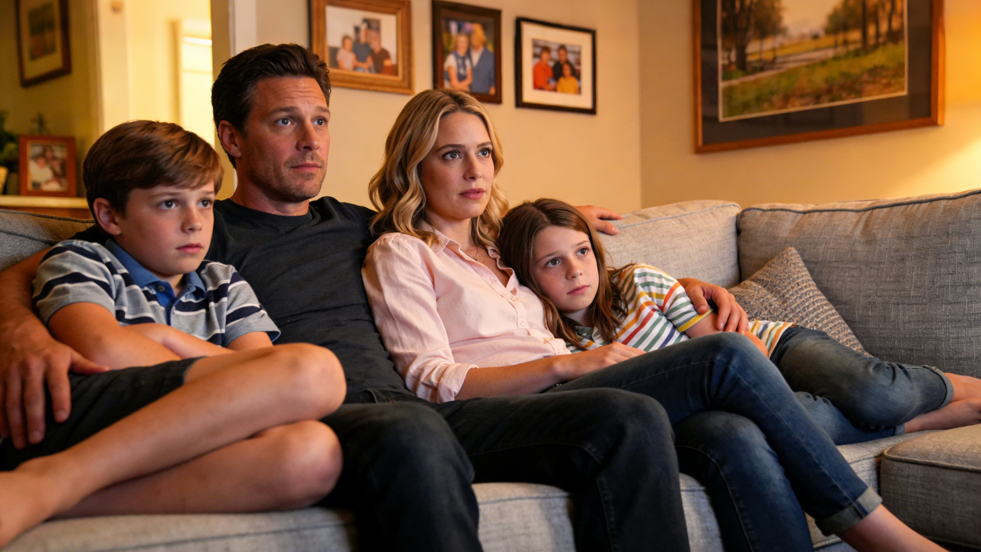 In a home environment, there is a slight wind sound from the living room air conditioner in the background, which is suitable for realistic daily life. Mom (softly sighing with surprise): Wow, I didn't expect this plot at all. Dad (agreeing in a low voice with a calm tone): Yeah, it's totally unexpected, never thought that would happen. Boy (with an excited tone): It's the best twist ever! Girl (nodding along with an excited tone): I can't believe they did that!