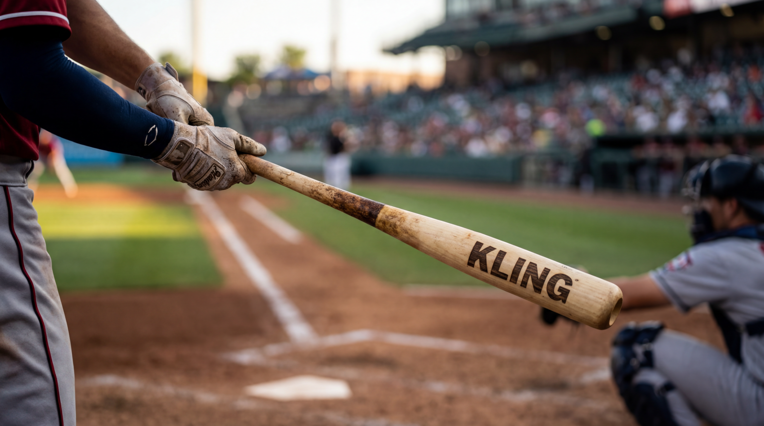 The camera always focuses on the "KLING" on the baseball bat, and the player hits the baseball