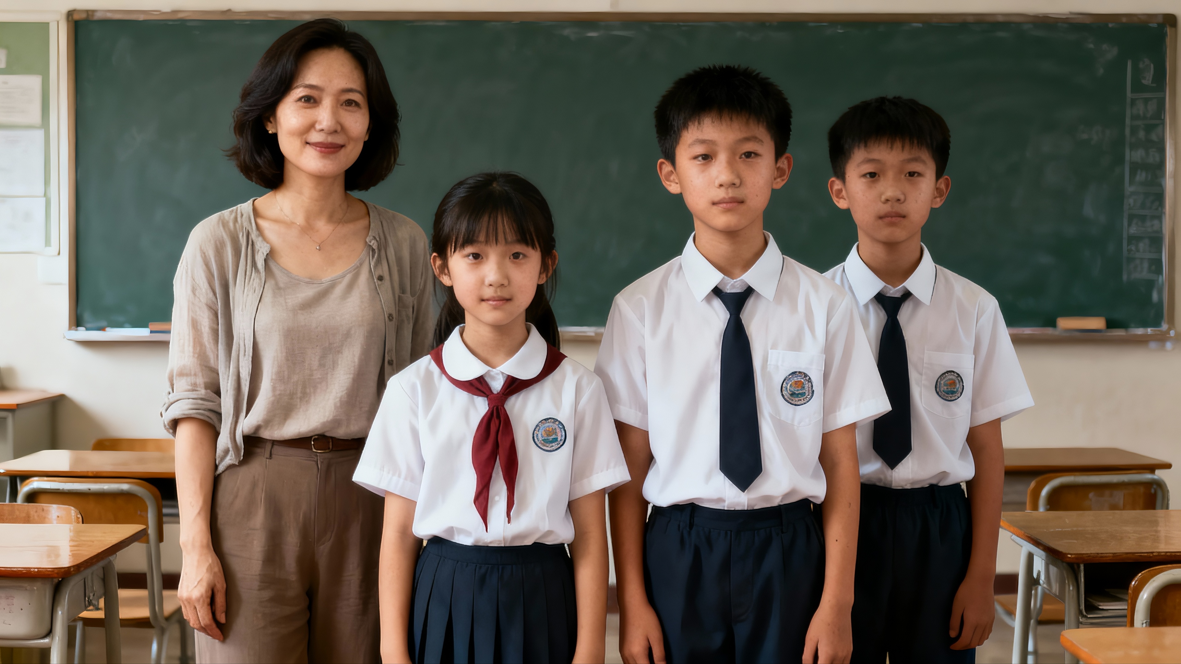 A female teacher and three students are standing in the classroom, the camera is fixed, the female teacher says: "We don't say it, it's for sure, but you can say it", then the speaker switches to a female student wearing a school uniform, the female student raises one hand and clenches a fist and says: "We are determined to win", then the speaker switches to the first male student wearing a uniform, the male student smiles and says: "Foolproof", then the speaker switches to a male student standing on the far right, wearing a uniform, the male student raises his hands and says, "You are sure to win."